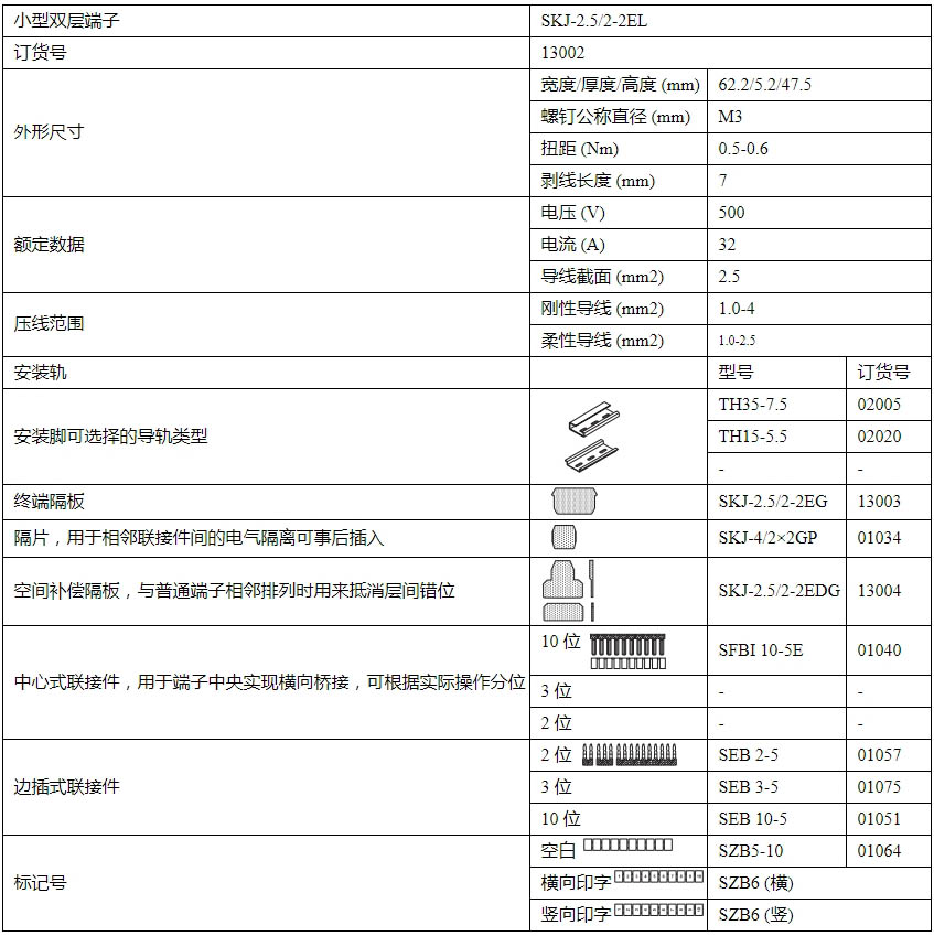 > 小型雙層端子SKJ-2.5/2-2EL具有SKJ-2.5/2-2E的所有優點,它的獨特之處是能用于電位分配,也即:它的上層與下層電氣相連。