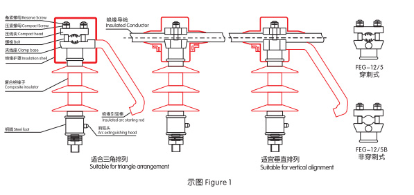 本產品分穿刺式和非穿刺式(剝除絕緣層)二種,其主要由絕緣護罩、夾線鋁合金金具、復合絕緣子、引弧棒和下鋼腳等組成,結構見示圖1。