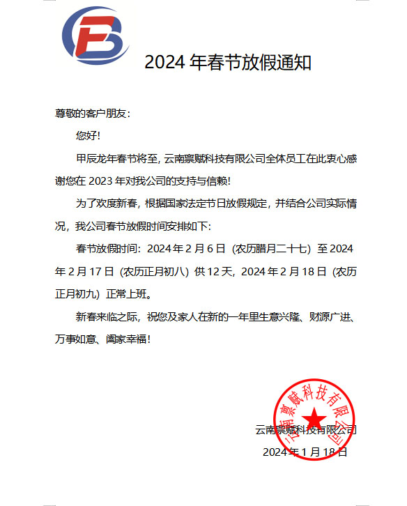 甲辰龍年春節將至,云南稟賦科技有限公司全體員工在此衷心感謝您在2023年對我公司的支持與信賴!