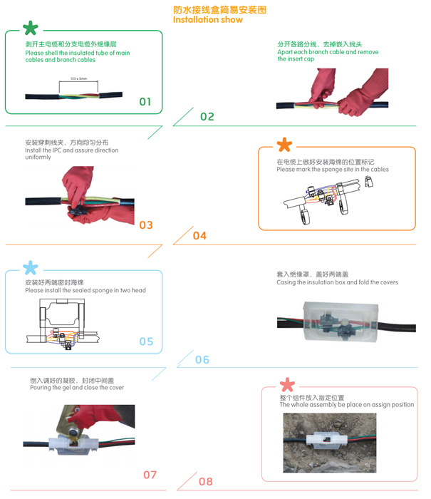 使用帶有電力硅凝膠進行密封的機械式堅固透明套管,不需要挖井,不需要電纜切割斷頭。灌膠連接后密封穩定,直接埋于地下,安裝方便快捷,具有卓越的防盜,防水,絕緣性能極佳。