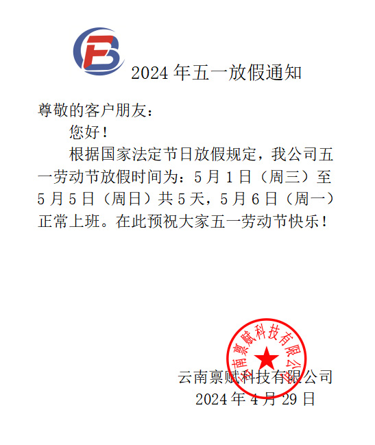 根據國家法定節假日放假規定,我公司五一勞動節放假時間為:5月1日(周三)至5月5日(周日)共5天,5月6日(周一)正常上班。在此預祝大家五一勞動節快樂!
