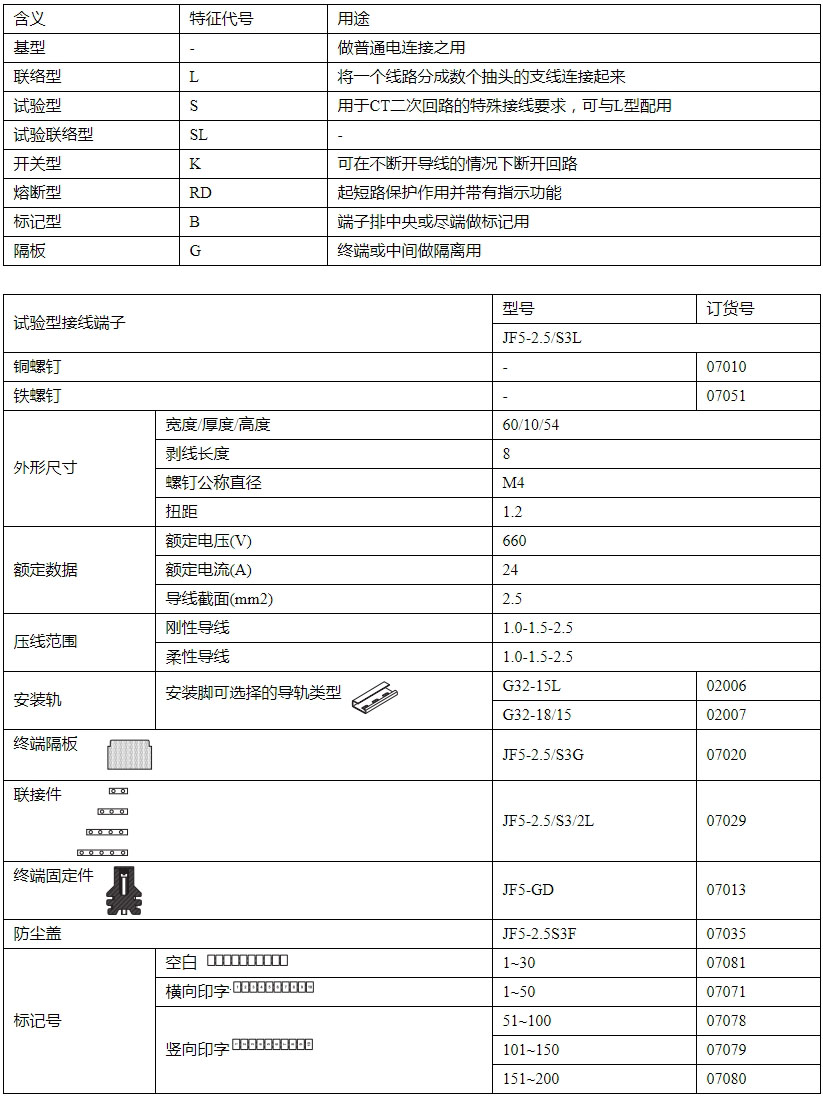 本系列接線端子用于交流50HZ(或60Hz),額定電壓660V或直流440V的電路中作圓銅導線截面0.75~25平方米的連接之用,其性能符合GB/T14048.1-2000《低壓開關設備和控制設備總則》,符合JB/T9659.1-1999《低壓成套開關設備和控制設備用接線端子排》,同時還符合IEC947-7-1:2000標準要求。產品絕緣材料采用PC,其阻燃性達到UL94-VO級,CTI≥600V,可在+120℃~-40℃環境溫度范圍內可靠工作。