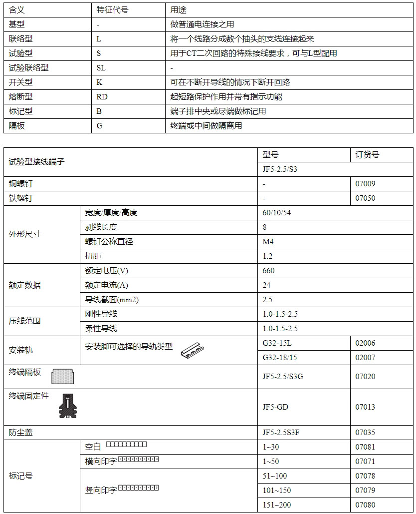 本系列接線端子用于交流50Hz(或60Hz),額定電壓660V或直流440V的電路中作圓銅導線截面0.75~25平方毫米的連接之用,其性能符合GB/T14048.1-2000《低壓開關設備和控制設備總則》,符合JB/T9659.1-1999《低壓成套開關設備和控制設備用接線端子排》,同時還符合IEC947-7-1:2000標準要求。產品絕緣材料采用PC,其阻燃性達到UL94-VO級,CTI≥600V,可在+120℃~-40℃環境溫度范圍內可靠工作。