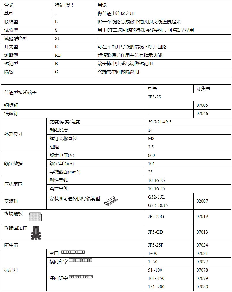 本系列接線端子用于交流50HZ(或60Hz),額定電壓660V或直流440V的電路中作圓銅導線截面0.75~25平方毫米的連接之用,其性能符合GB/T14048.1-2000《低壓開關設備和控制設備總則》,符合JB/T9659.1-1999《低壓成套開關設備和控制設備用接線端子排》,同時還符合IEC947-7-1:2000標準要求。產品絕緣材料采用PC,其阻燃性達到UL94-VO級,CTI≥600V,可在+120℃~-40℃環境溫度范圍內可靠工作。