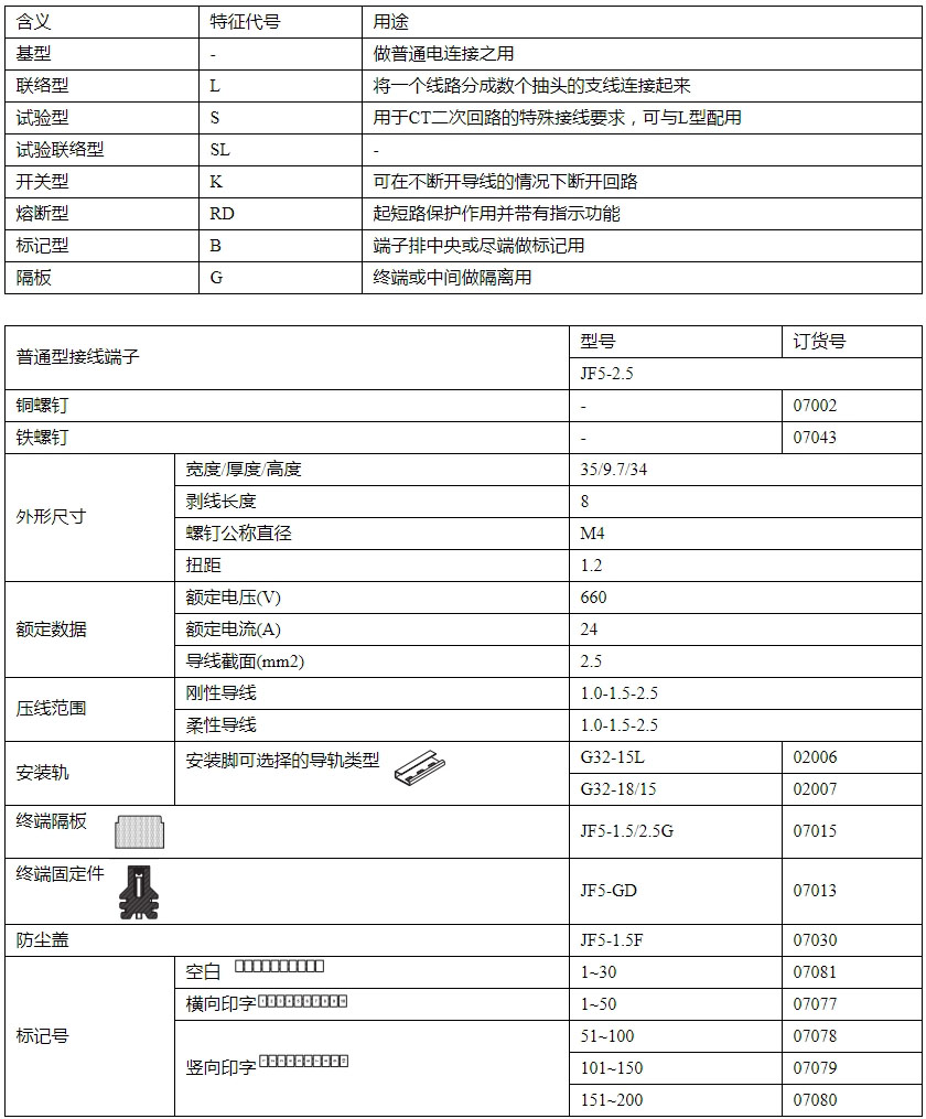 本系列接線端子用于交流50HZ(或60Hz),額定電壓660V或直流440V的電路中作圓銅導(dǎo)線截面0.75~2平方毫米的連接之用,其性能符合GB/T14048.1-2000《低壓開關(guān)設(shè)備和控制設(shè)備總則》,符合JB/T9659.1-1999《低壓成套開關(guān)設(shè)備和控制設(shè)備用接線端子排》,同時還符合IEC947-7-1:2000標(biāo)準(zhǔn)要求。產(chǎn)品絕緣材料采用PC,其阻燃性達(dá)到UL94-VO級,CTI≥600V,可在+120℃~-40℃環(huán)境溫度范圍內(nèi)可靠工作。