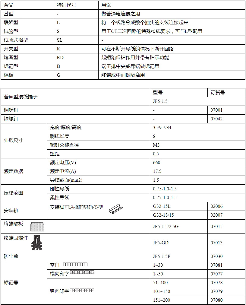 使用說明:本系列接線端子用于交流50HZ(或60Hz),額定電壓660V或直流440V的電路中作圓銅導(dǎo)線截面0.75~25平方毫米的連接之用,其性能符合GB/T14048.1-2000《低壓開關(guān)設(shè)備和控制設(shè)備總則》,符合JB/T9659.1-1999《低壓成套開關(guān)設(shè)備和控制設(shè)備用接線端子排》,同時(shí)還符合IEC947-7-1:2000標(biāo)準(zhǔn)要求。產(chǎn)品絕緣材料采用PC,其阻燃性達(dá)到UL94-VO級(jí),CTI≥600V,可在+120℃~-40℃環(huán)境溫度范圍內(nèi)可靠工作。